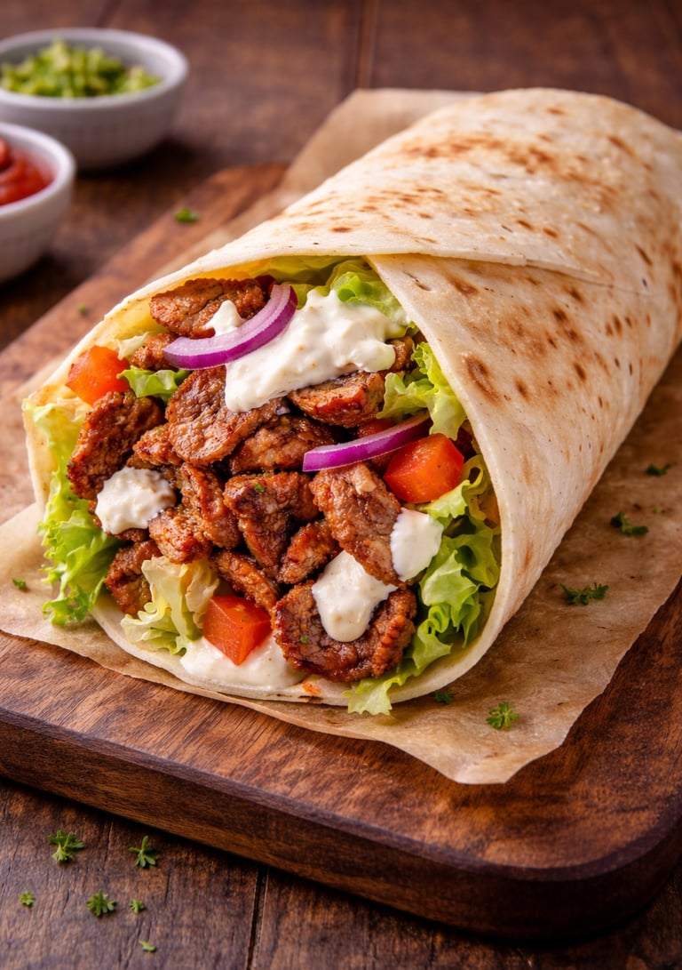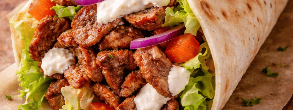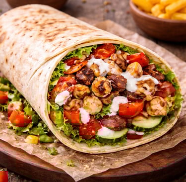 Kebab, chicken, bacon, fresh salad, and dressing.